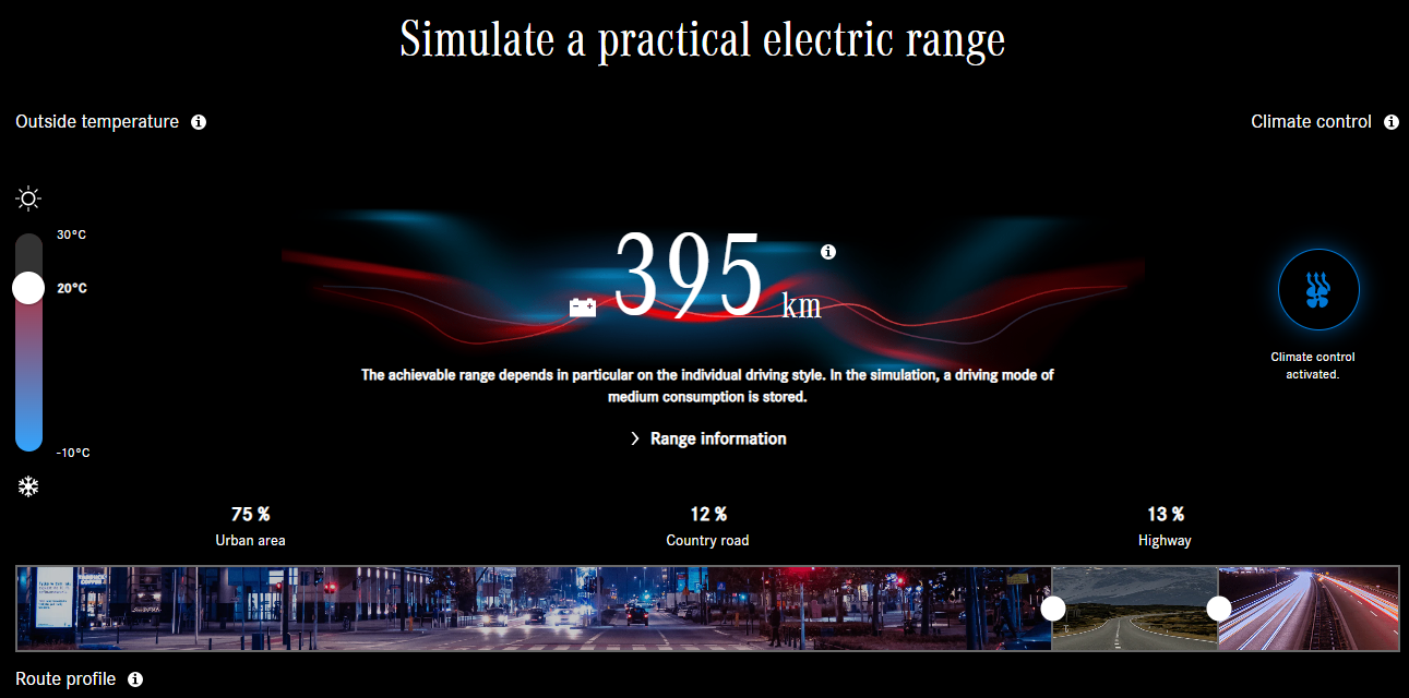 The battery is rated at 66.5 kWh and the claimed range (from 100% charged) is between 395 and 423 km. Mercedes-Benz SA’s website has a nifty range simulator that allows you to input your driving style, road conditions and weather conditions to calculate the distance you could achieve on a single charge.
