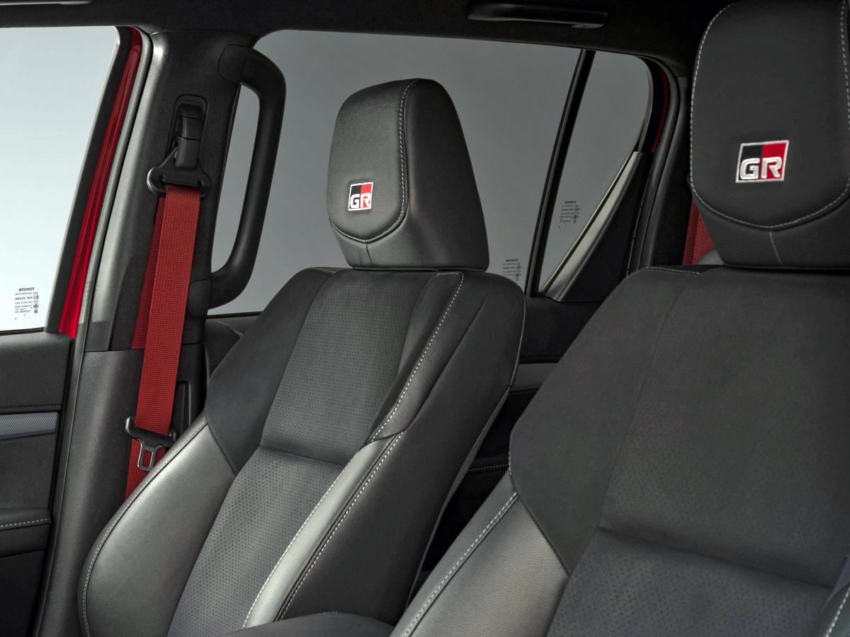 Inside, you’ll find a smattering of red accents, along with paddle shifters, alloy pedals and crimson-hued seatbelts. The Hilux GR Sport’s front seats have been upholstered in a combination of black synthetic suede and leather, with silver stitching and perforations.