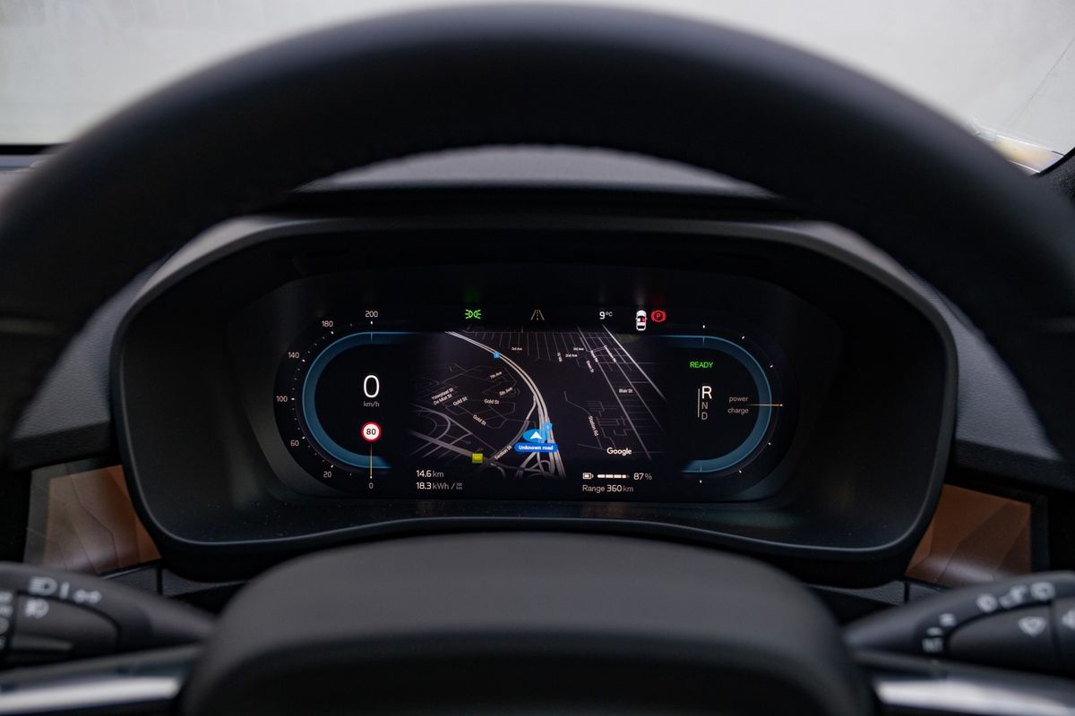The central dashboard is dominated by a portrait-style 9-inch touchscreen infotainment system, which has a simple and easy-to-navigate menu layout. The menu’s text is rather small though, which negatively impacts usability, but we’d consider that a minor gripe. The navigation system integrates battery-energy projections to help you plan your route and locate public charging stations. The Range Assistant menu tab is also useful to keep an eye on current energy consumption and range while you are driving.