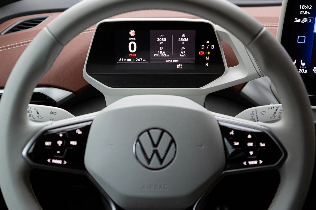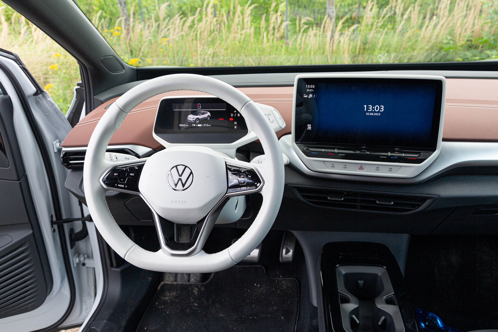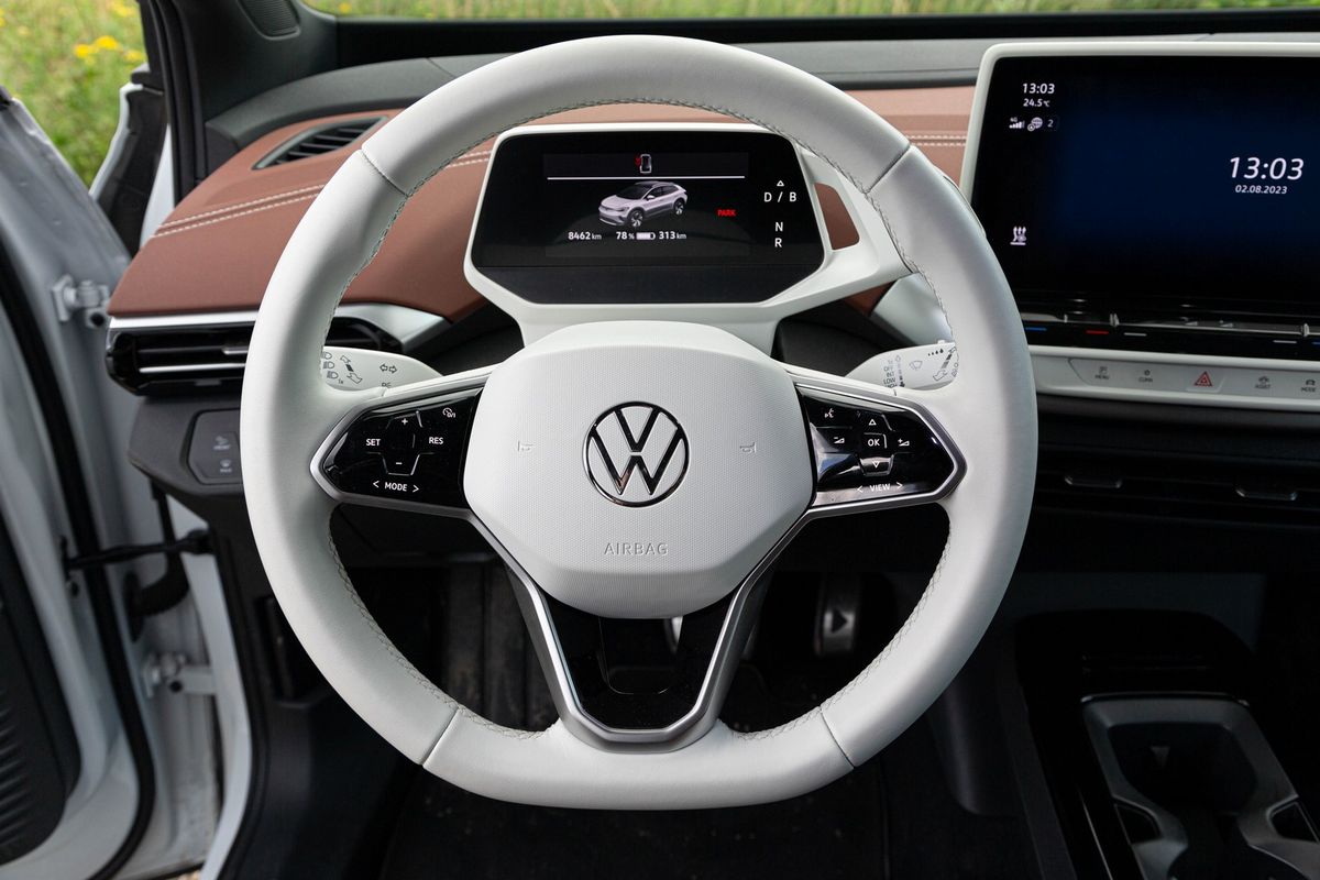 Our Volkswagen ID.4 test unit was fitted with the optional white-and-brown interior trim combination. We wonder how long the white steering wheel rim would look as pristine as it does in these pics, but it’s still an eye-catching tiller. We like how the infotainment screen is angled towards the driver too.