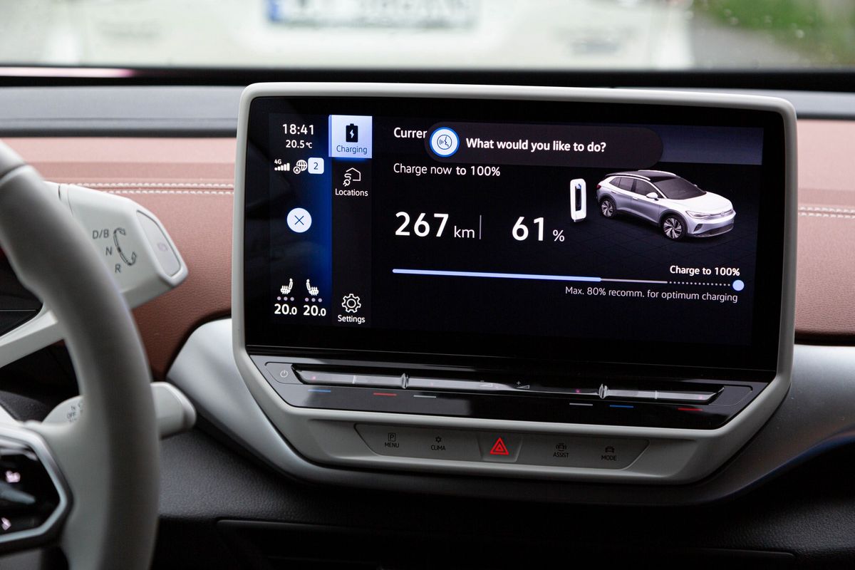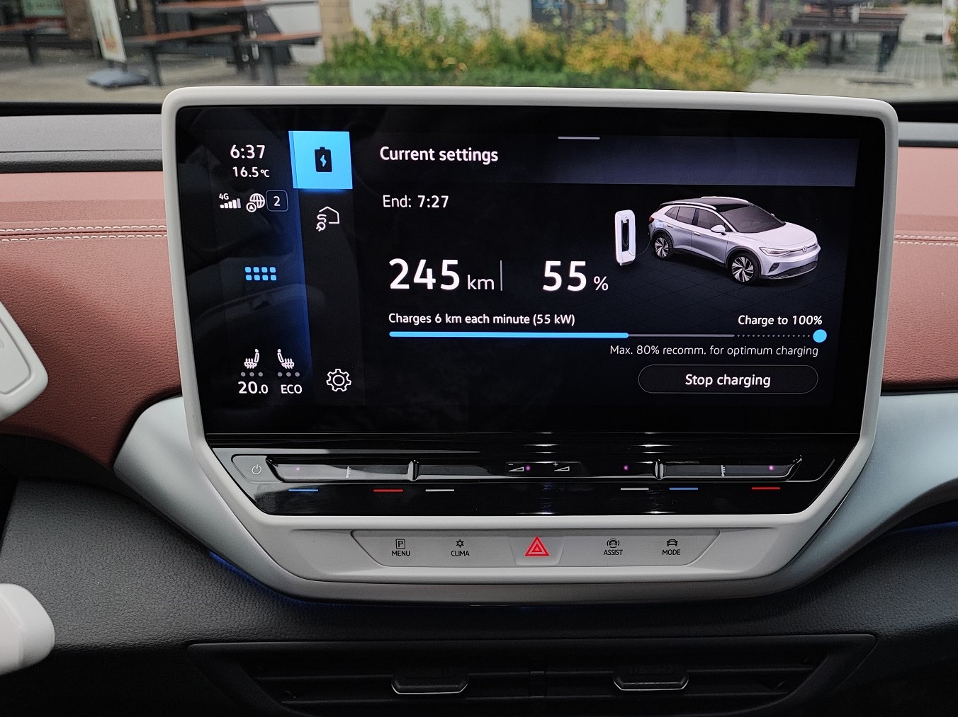 The opposite is also true, it’s not best practice to charge the vehicle to 100% every time; an operating charge window from 10% to 80% is better for the longevity of the cell pack. Interestingly, recharging the vehicle from 80% to 100% would take about the same time as achieving a 20% to 80% replenishment. When we plugged the ID.4 into a 140 kW DC (fast) charger, the vehicle refused to accept more than 55 kW. It was a pity, because 125 kW would’ve charged the battery from 5% to 80% in around 30 minutes.