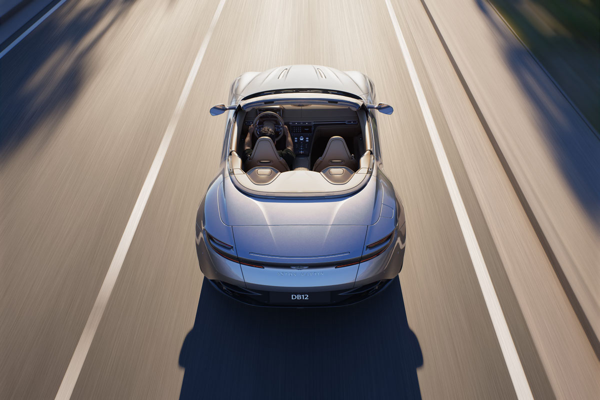When raised, the newcomer’s sinuous roofline maintains the recently revealed DB12 Coupe’s sleek profile, but once lowered (and concealed beneath the hard tonneau), the DB12 Volante’s uninterrupted beltline culminates and, let us quote the Gaydon-based manufacturer verbatim: “a lithe and muscular tail that puts the lumpen efforts of package-compromised rivals to shame”. Well, there you have it!