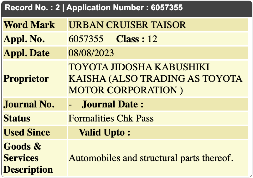 Toyota Applies to Trademark ‘Urban Cruiser Taisor’ Badge