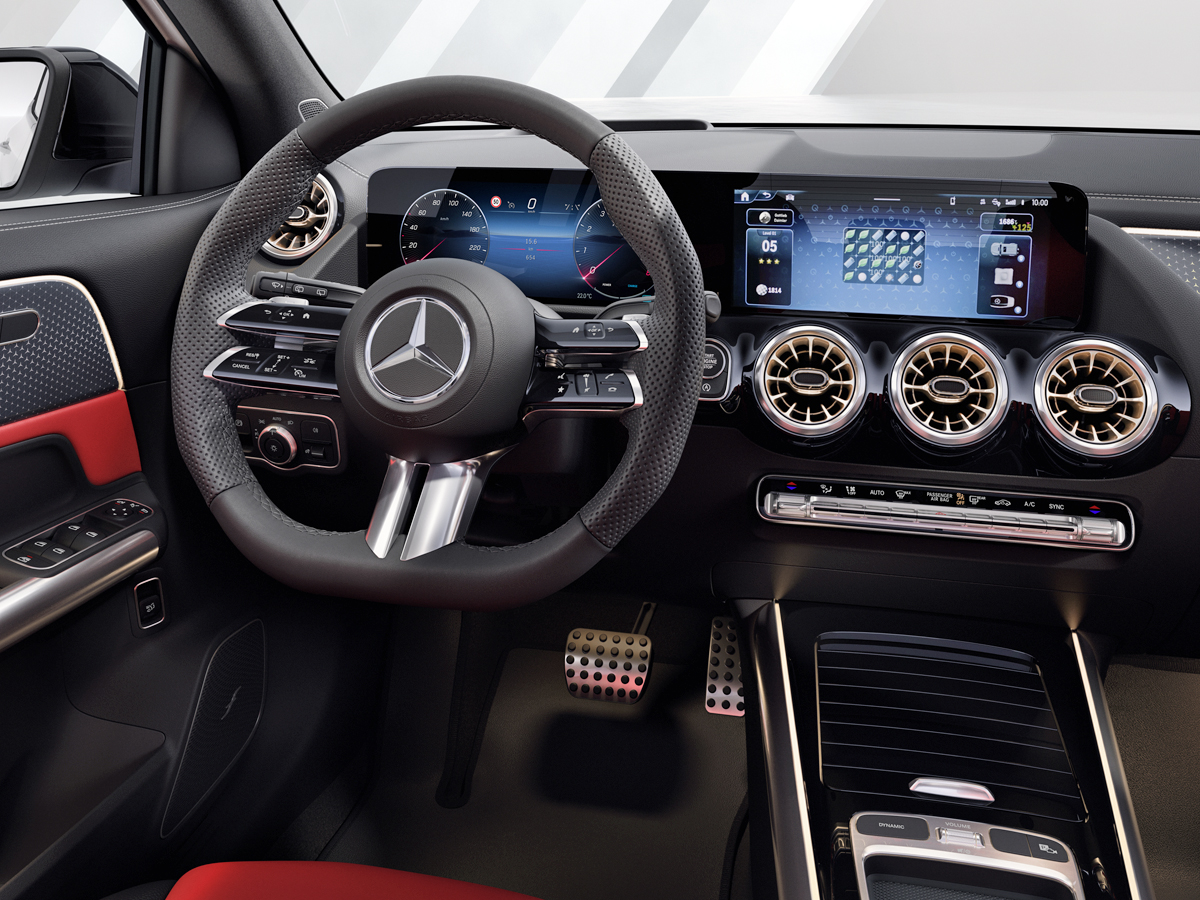 So, what sort of styling updates have been applied to the GLA? Well, the standard model gains a redesigned grille with vertical louvres, while the restyled front bumper features what Mercedes-Benz calls “visual underride protection”. There are also new lighting signatures, front and back. Inside, the free-standing dual screen comprises a 7-inch instrument cluster and a 10.25-inch infotainment display as standard.
