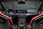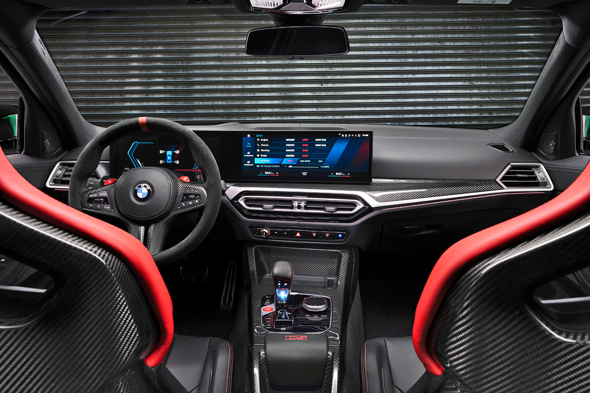 Inside, the M3 CS features electric and heated M Carbon bucket seats with integral head restraints and illuminated model badges. These special pews are upholstered in Merino leather with a black-and-red colour scheme and contrast stitching. This 2-tone finish is repeated on the pair of seats at the rear, while the door panels are trimmed in black leather.