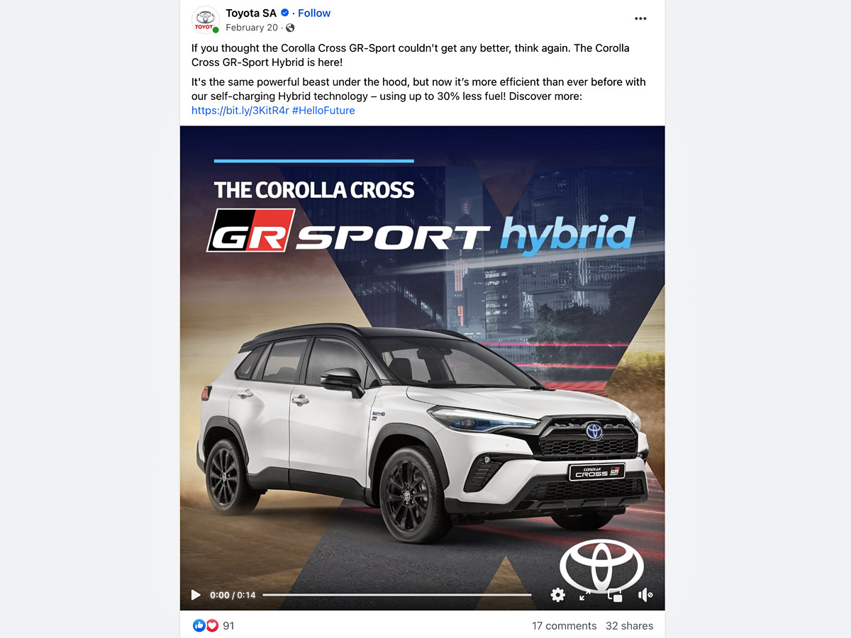 Complainant Justin Brown approached the advertising watchdog about a Facebook post (dated 20 February 2023) from Toyota promoting its locally built Corolla Cross GR-Sport Hybrid. The advert in question included the following text: “If you thought the Corolla Cross GR-Sport couldn’t get any better, think again. The Corolla Cross GR-Sport Hybrid is here!”.