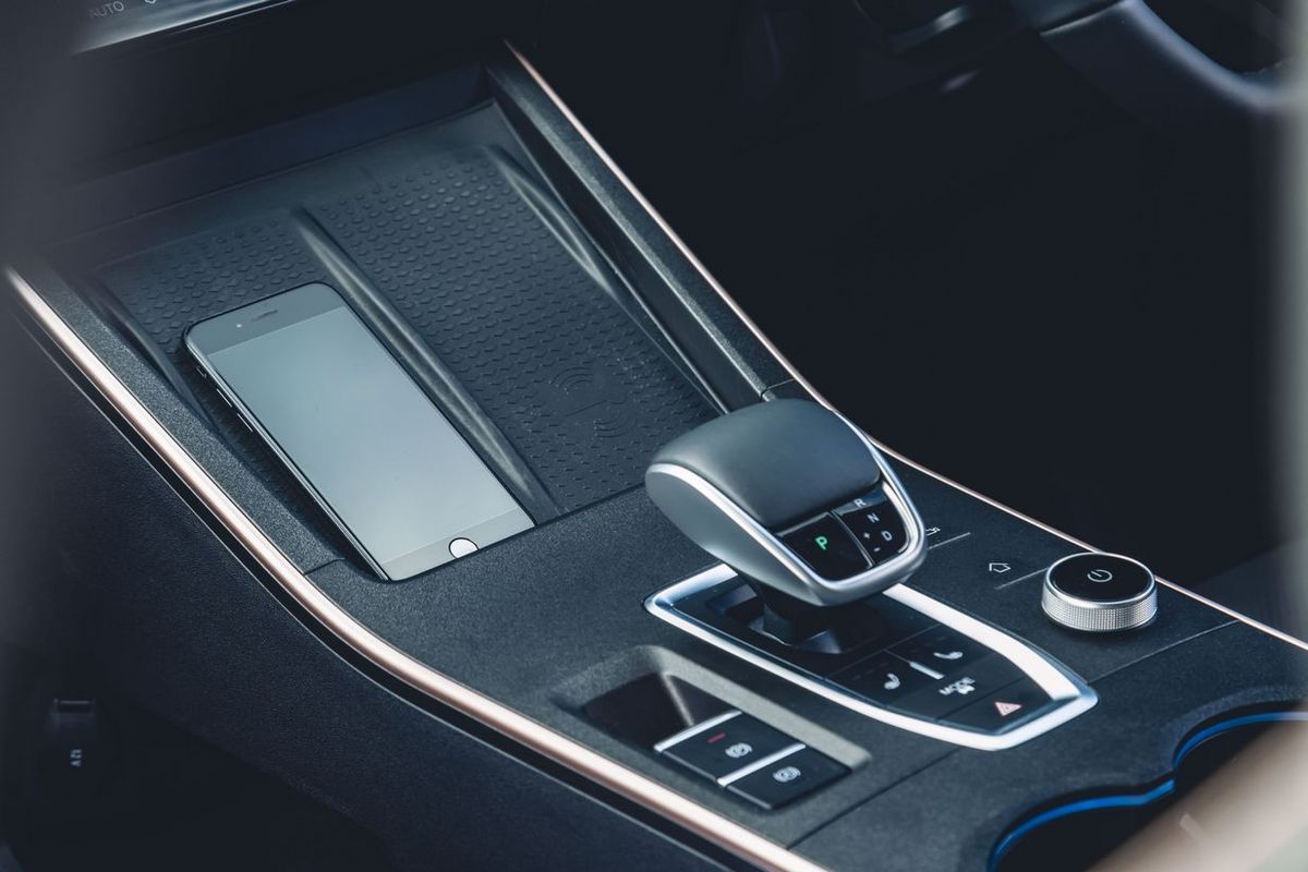 Just ahead of the transmission lever is a felt-trimmed pad big enough for 2 phones to rest upright, with 1 wireless charger. Apple Carplay and Android Auto both connect wirelessly, while USB-A and USB-C ports are located below the floating console on the passenger side. Rear passengers share one USB-C port.