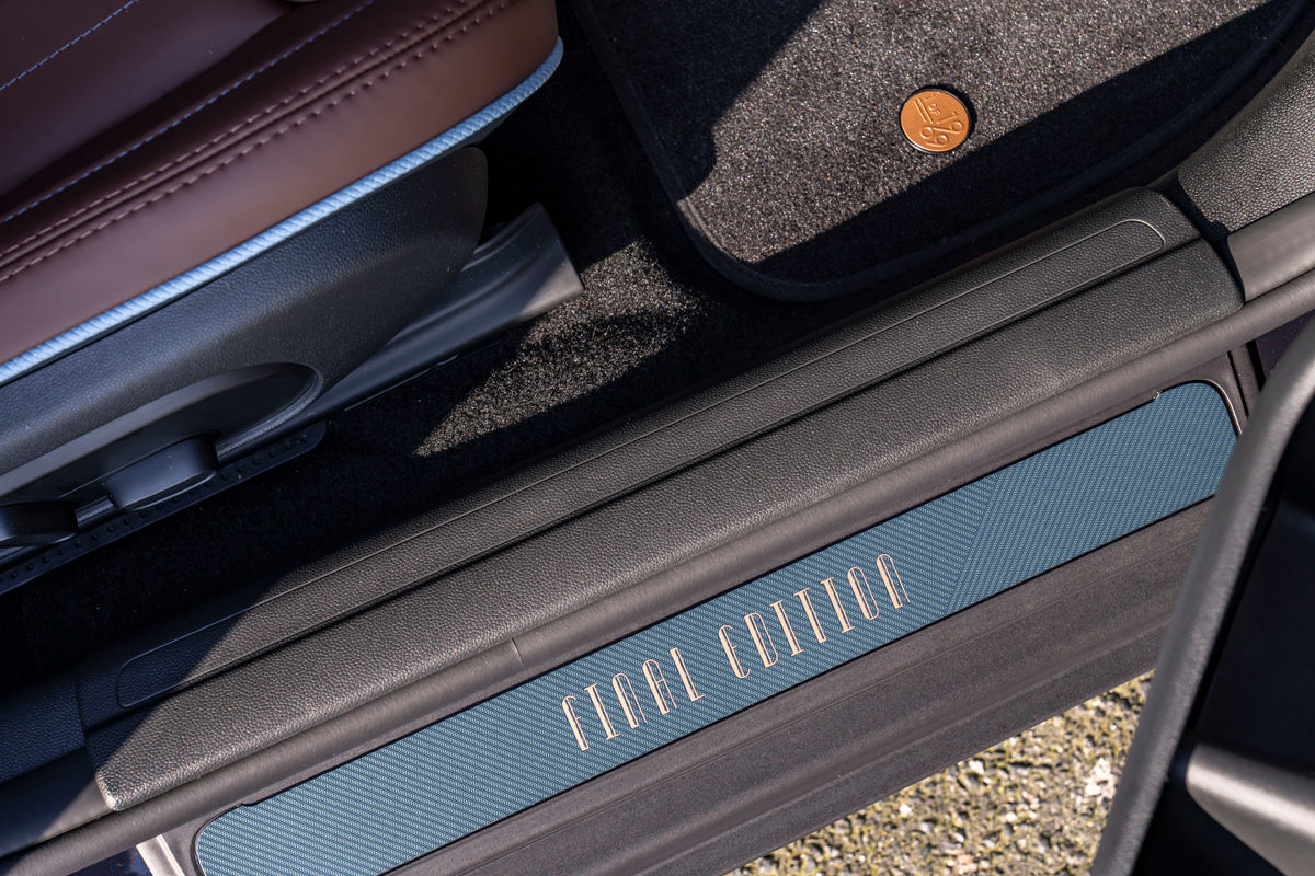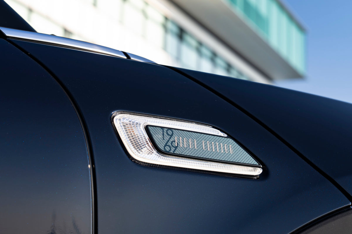 Dark dashboard trim is framed by trim strips in Sage Green Dark and the edition-specific Shimmer Copper colour. On the passenger side, you’ll find another a “1 of 1969” badge, which is repeated on the floor mats.