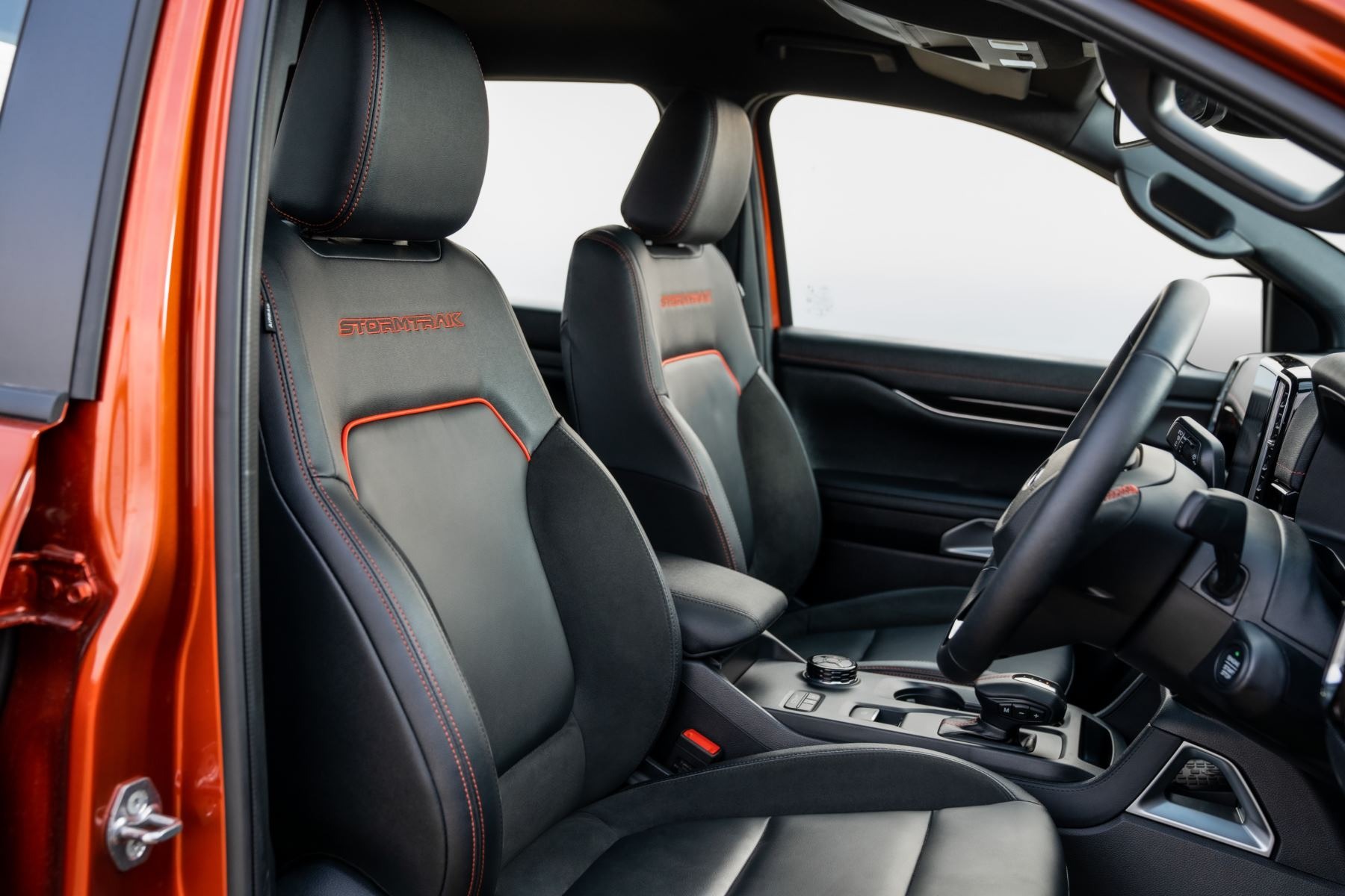 Inside, red details abound. These include Stormtrak stitching on the backrests of the front seats and red stitching on the multifunction steering wheel and transmission lever.