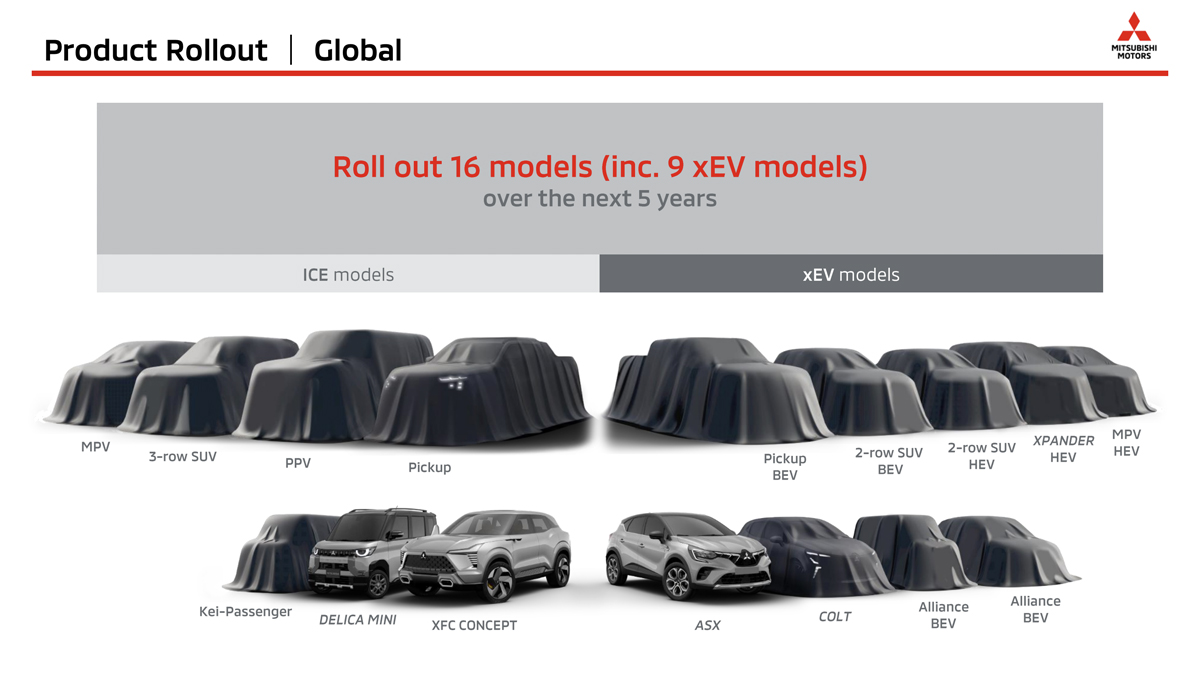 The disguised “Pick-up EV” is show alongside a new likewise-electric 2-row SUV and a hybrid-powered 2-row SUV. Mitsubishi also lists the new ASX (based on the Renault Captur), an Alliance BEV, a hybrid Xpander and a hybrid MPV. Interestingly, the new Colt – effectively a rebadged Renault Clio – does not appear in the leverage-region section.