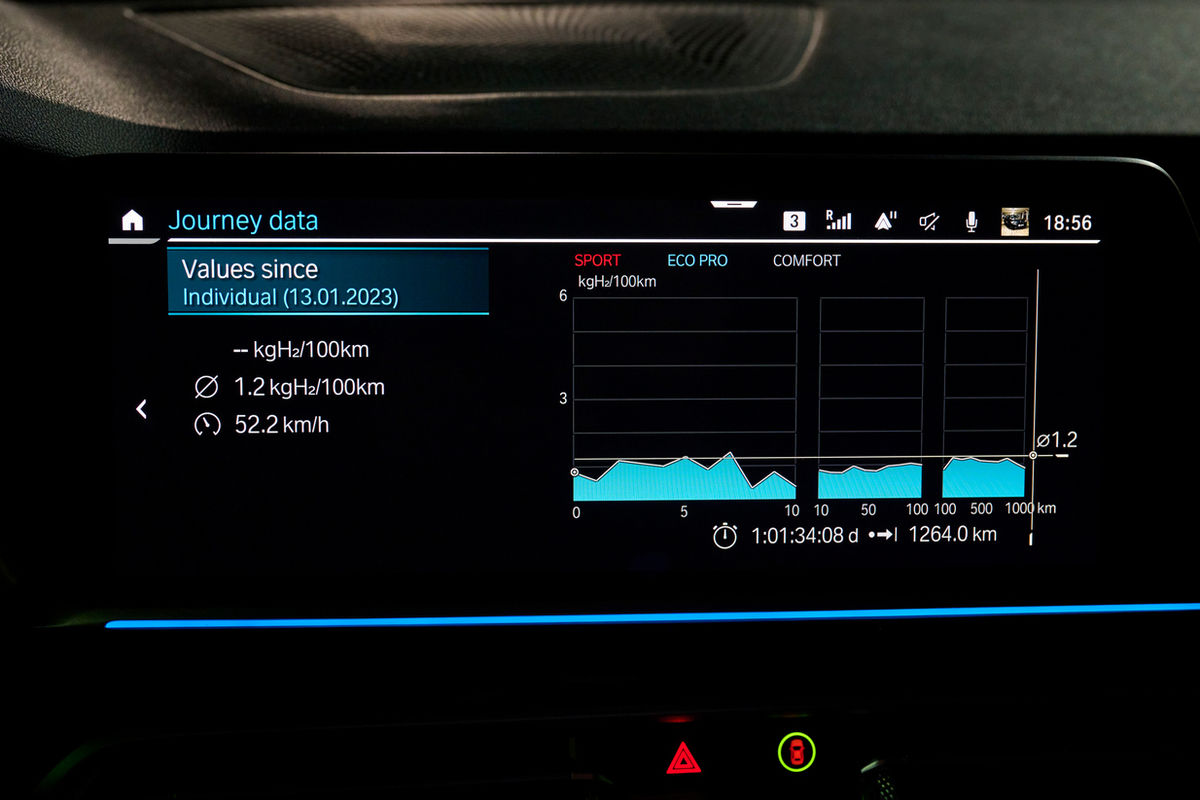 It takes approximately 5 minutes to refuel the BMW iX5 Hydrogen; we achieved 1.4 kg/100 km on the test route.