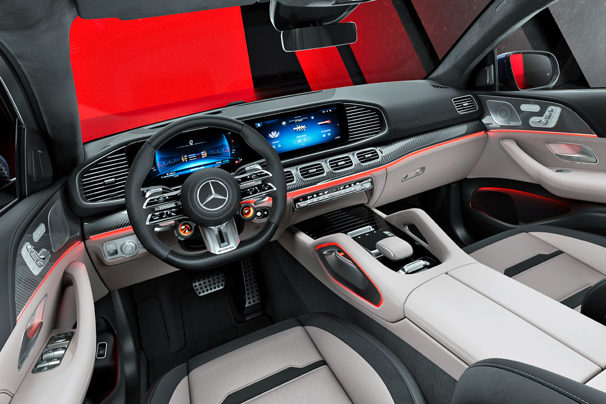 In addition, the bonnet now bears the AMG emblem rather than the Mercedes-Benz star (which is, of course, still present in oversized form on the grille). New 22‑inch forged wheels in a 10‑twin‑spoke design are now also available as an option. Inside, you’ll find fresh leather-upholstery colour schemes and the latest generation of the MBUX infotainment system, complete with an AMG-specific screen design.