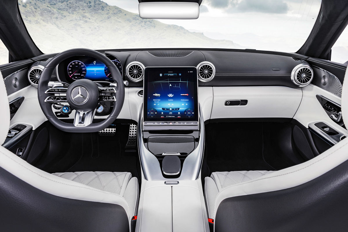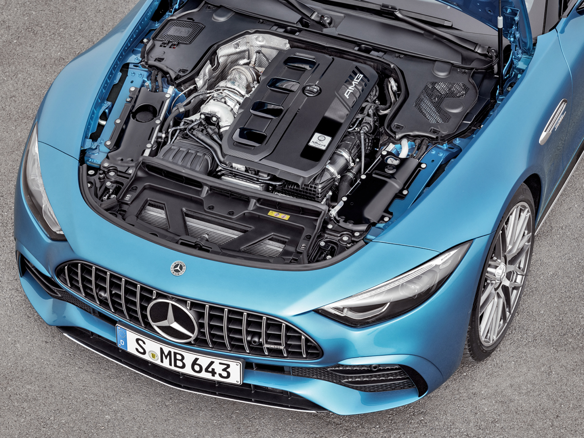 The turbocharger is operated via a 48V electrical system, which furthermore feeds the belt-driven starter-generator (effectively rendering the roadster a mild hybrid). As a result, the SL43 boasts a peak power output of 280 kW and a maximum torque figure of 480 Nm, plus an additional “short-term boost” of 10 kW “in certain driving situations”.