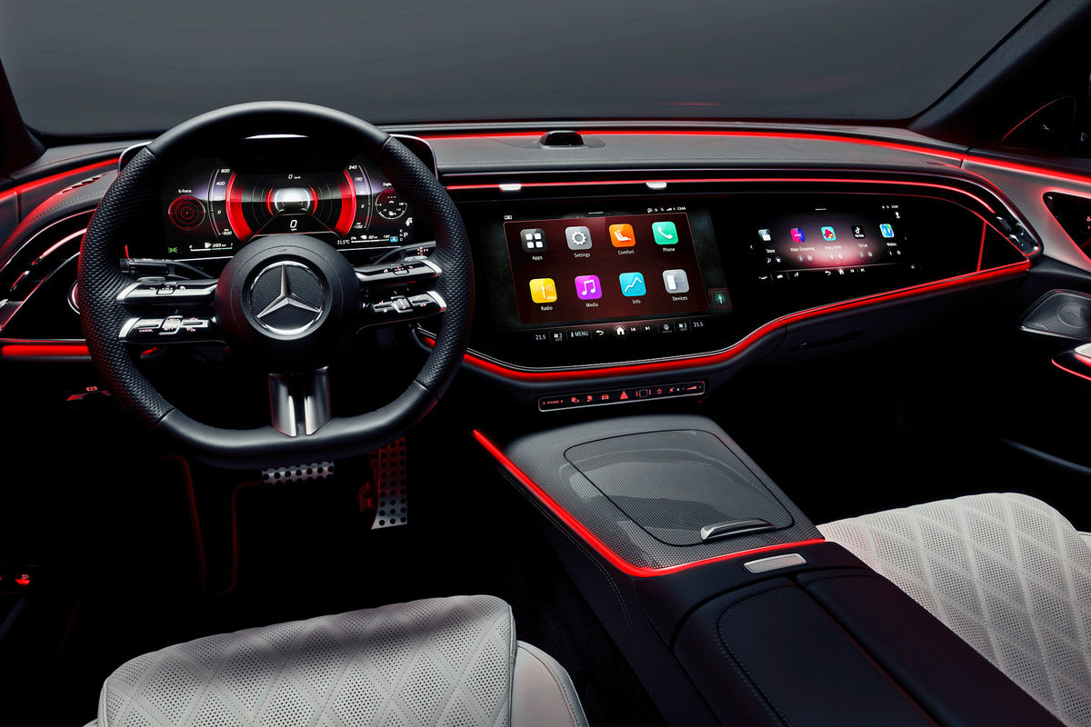 Like the Hyperscreen arrangement in the likes of the S-Class and the EQS, the new E-Class dashboard is dominated by digital displays. If the optional front passenger screen is specified, the large glass surface of the MBUX Superscreen extends to the central display, too.