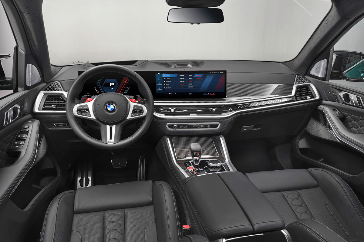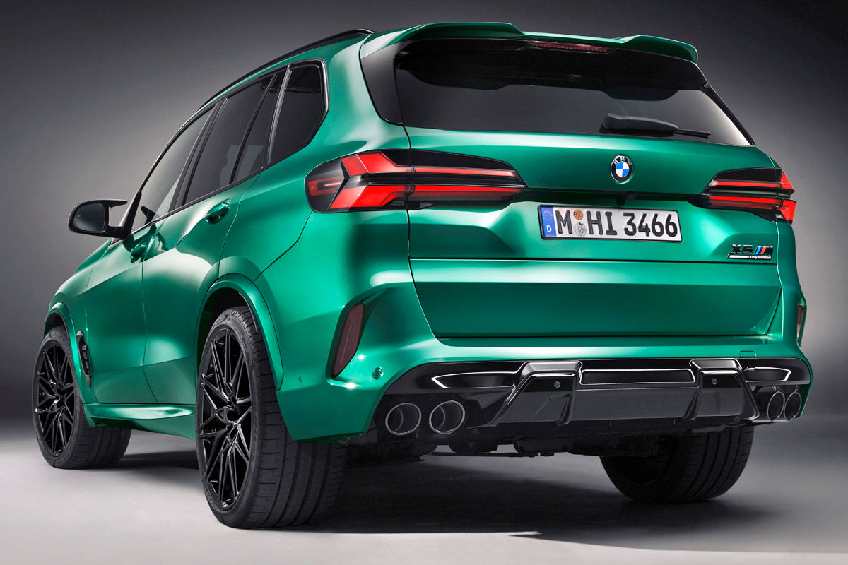 Round back, a prominent diffuser insert extends downwards at the lower edge of the rear apron and provides a border for the 2 pairs of twin-tailpipes. The X5 M Competition also gains X-shaped fibre-optic light-guide elements in its taillights and brake lights. Both models ship standard on 21-inch M light-alloy wheels at the front paired with 22-inch items at the rear.