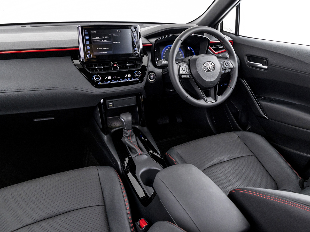 The GR-Sport’s cabin boasts leather upholstery with red stitching.