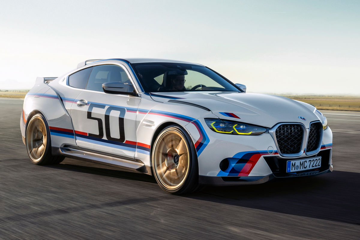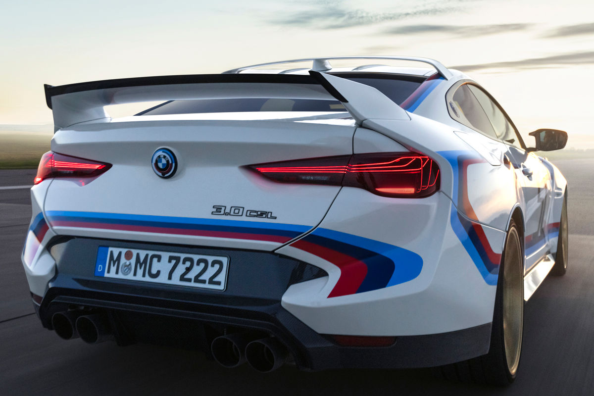 Based on the G82-generation M4, the 3.0 CSL gains a distinctive aerodynamics package, including aggressively contoured wheel arches (framing gold-coloured forged light-alloy wheels in a Y-spoke design, measuring 20 inches up front and 21 inches at the rear), a hefty rear spoiler and numerous other details based on the design of the legendary 1970s coupé. The roof spoiler, meanwhile, is made from glass-fibre reinforced plastic while the rear silencer is titanium.