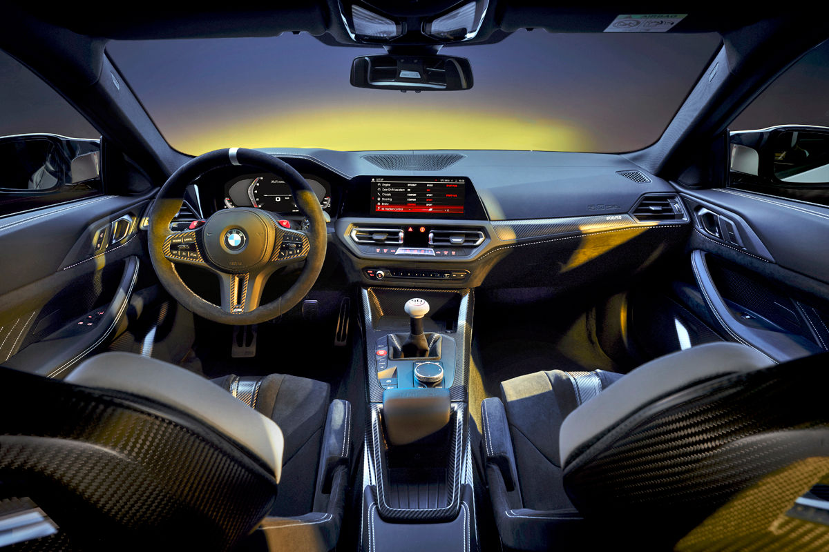 Inside, you’ll find yet more carbon and other lightweight construction measures. The rear seats have been binned in favour of a storage system with two integrated helmet compartments. The driver and passenger sit in M Carbon full bucket seats, which offer removable headrest inserts. Materials include black Alcantara for the seat surfaces (and other areas), along with an M Alcantara steering wheel and an anthracite roof liner, plus various matte-carbon finishes.
