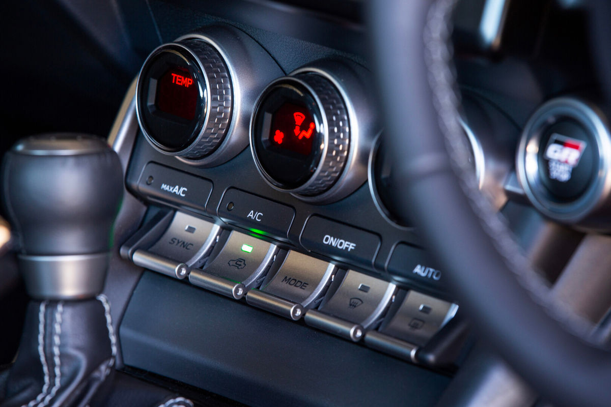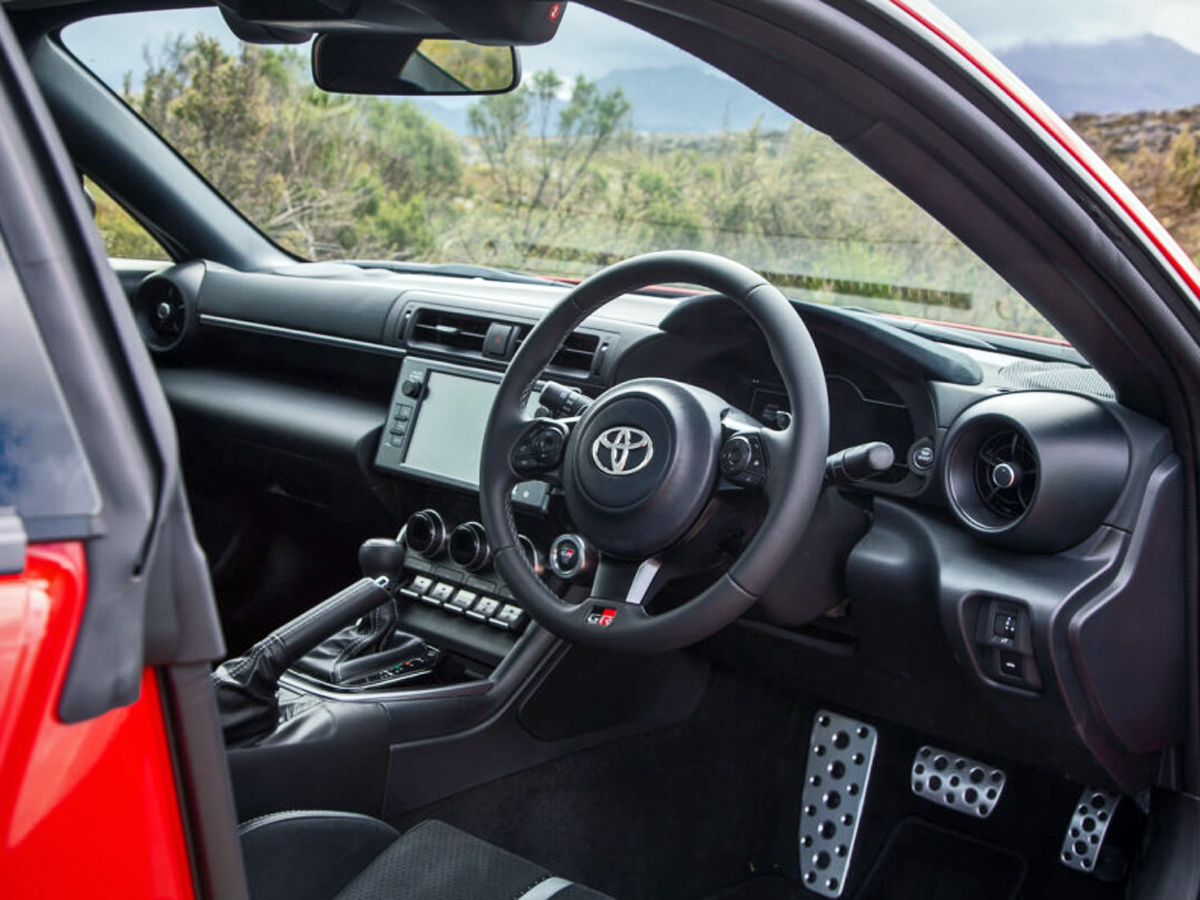 Although the cabin architecture is instantly familiar (in terms of layout and carried-over switchgear), the GR86 features new conveniences, such as a 7-inch TFT driver info display and an 8-inch infotainment touchscreen. While some interior plastics remain disappointingly firm to the touch, some respite can be found in the form of a leather-bound steering wheel and transmission lever, as well as suede-covered door panels and a central armrest – the latter incorporating a neat storage compartment.