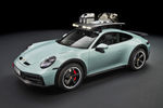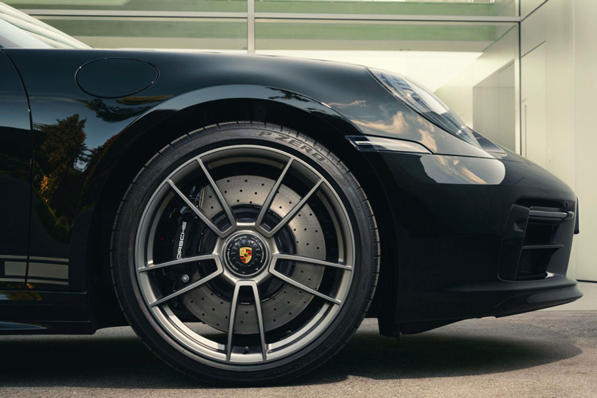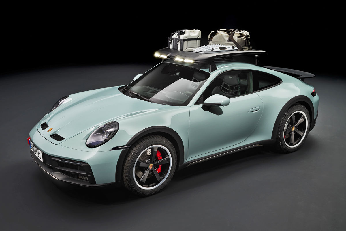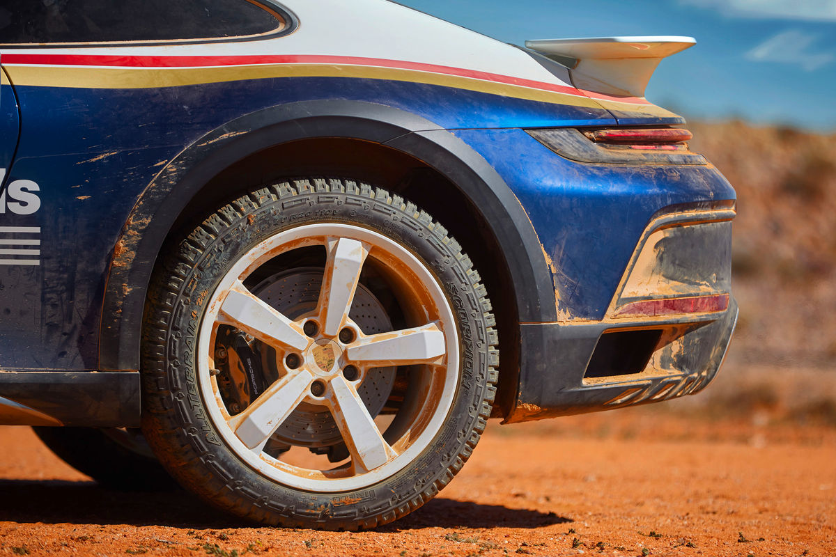 The off-roading 911 rides on specially developed “highly cut-resistant” Pirelli Scorpion All Terrain Plus tyres (sized 245/45 ZR19 fore and 295/40 ZR20 aft) featuring a 9 mm deep tread pattern and reinforced sidewalls. While this all-terrain rubber ships standard (and sees the top speed limited to 240 kph rather than the 309 kph attainable by the PDK-equipped GTS), Pirelli P Zero summer and winter tyres will be available as an option.