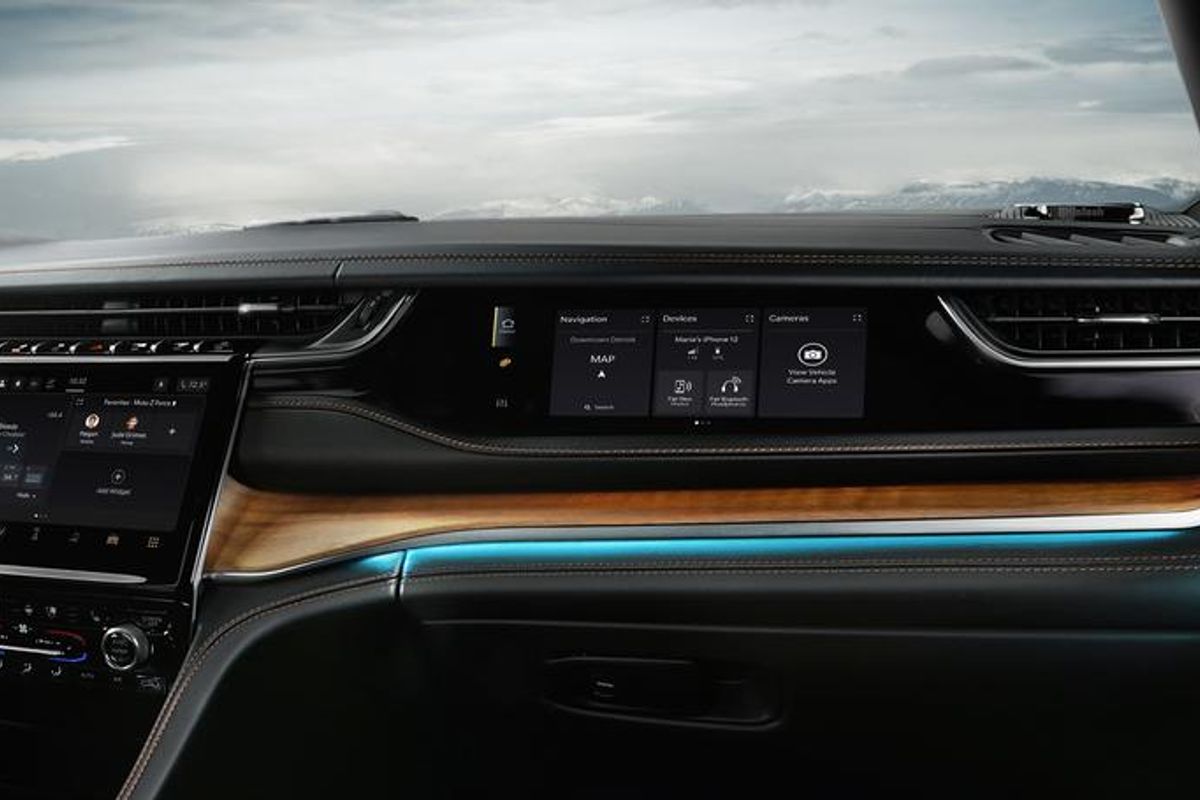 The infotainment system offers wireless Apple CarPlay and Android Auto, Bluetooth, 5 user profiles with valet mode and connectivity via the Uconnect mobile app.