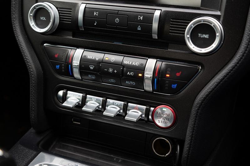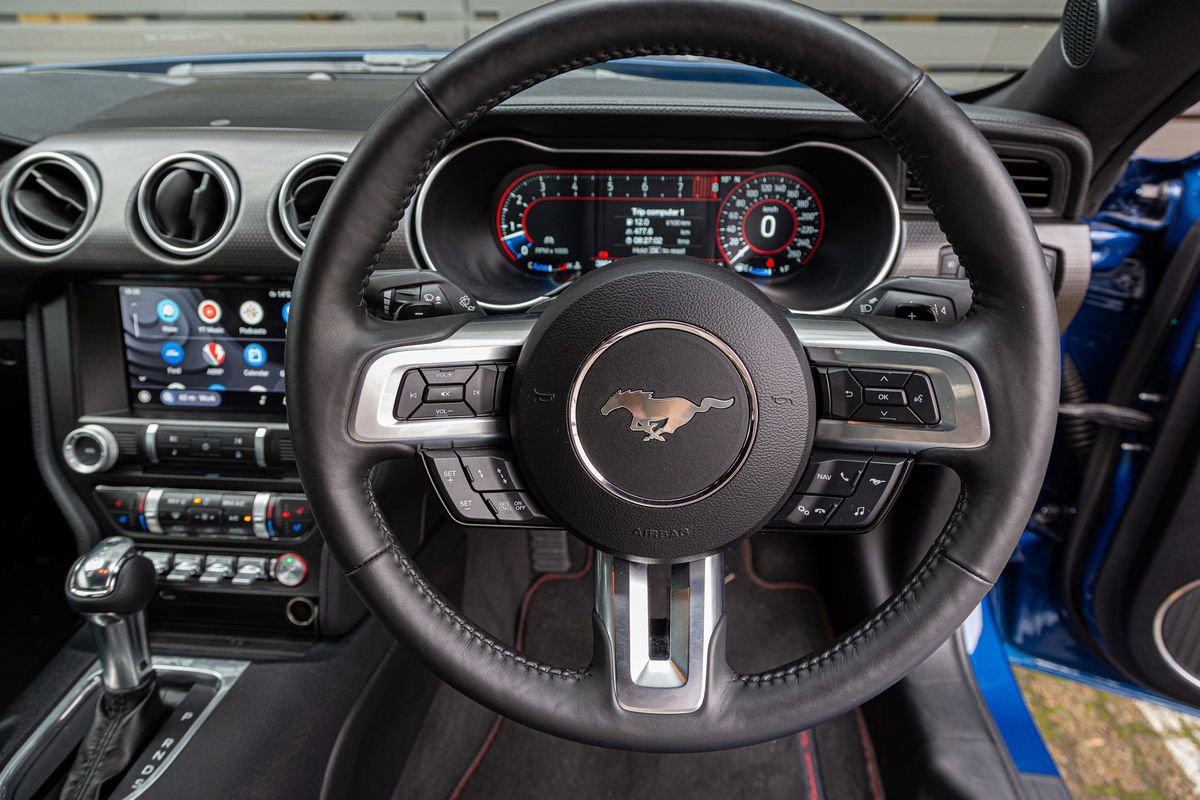 The button-festooned multifunction steering wheel with the pony logo on full display.