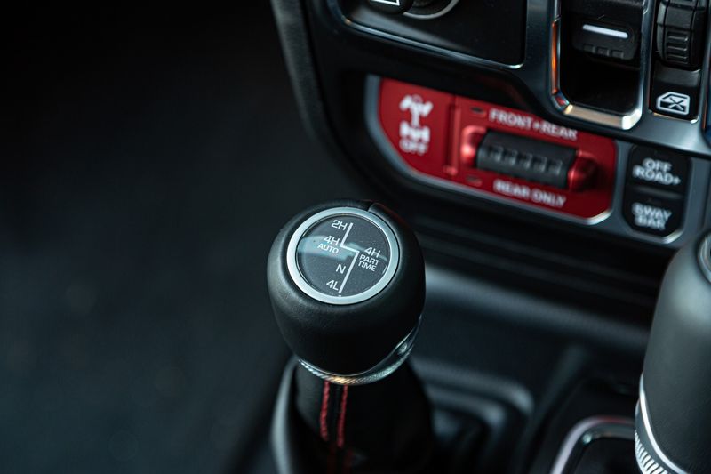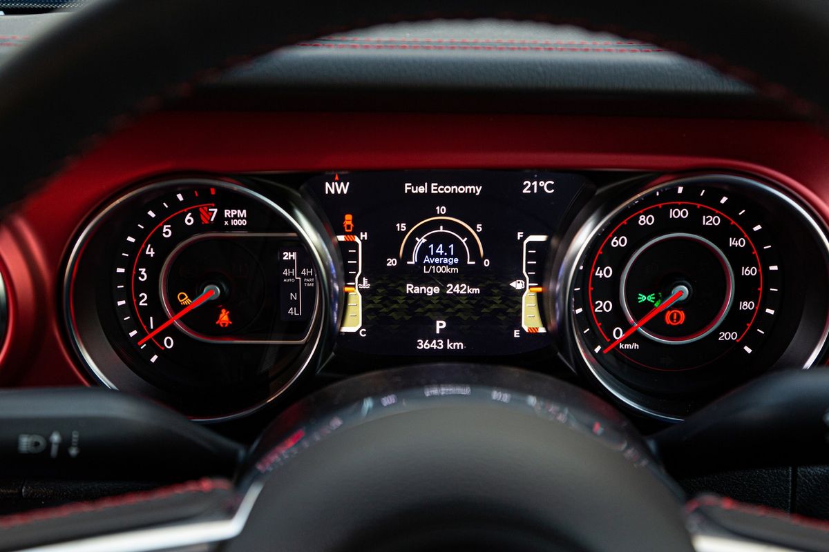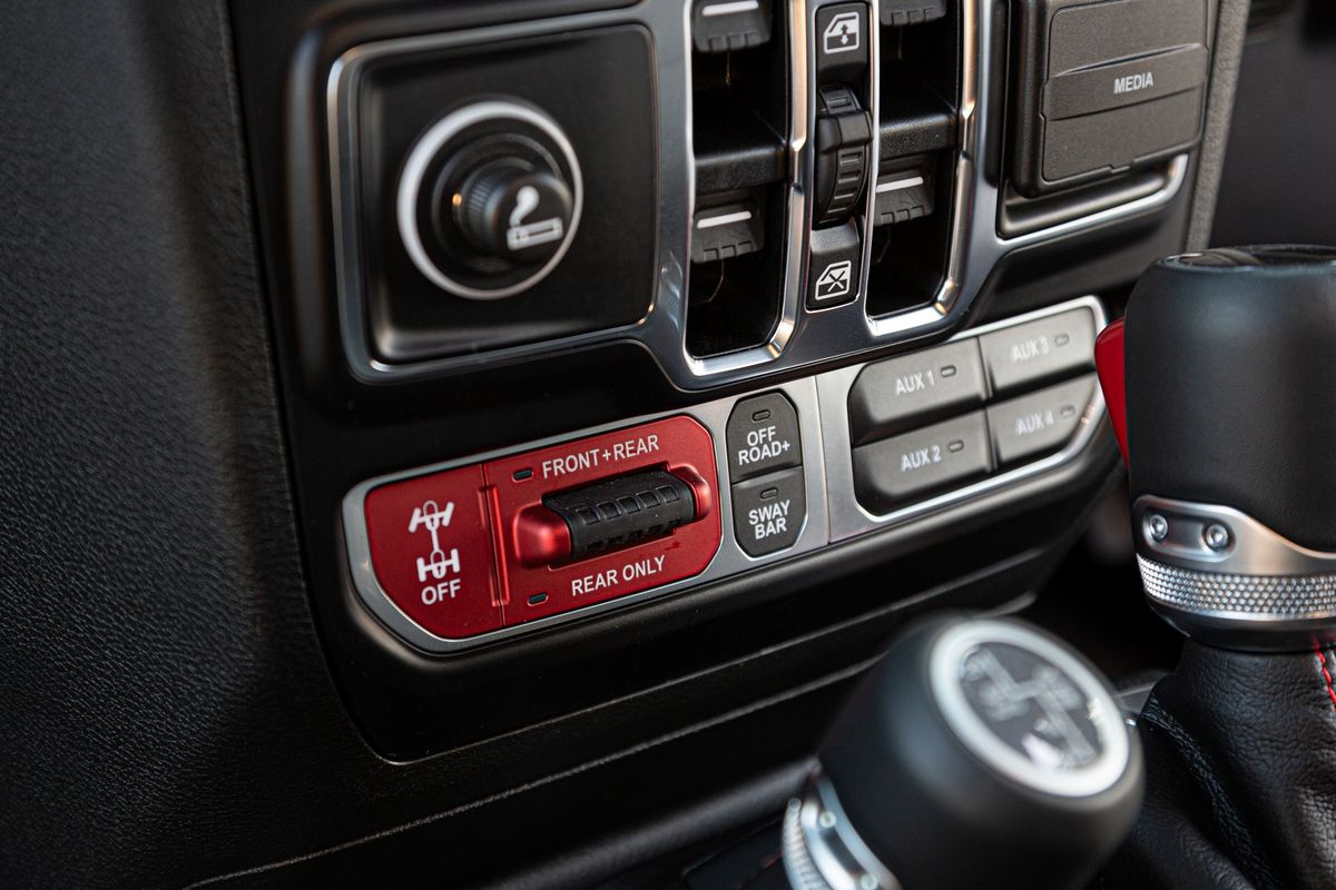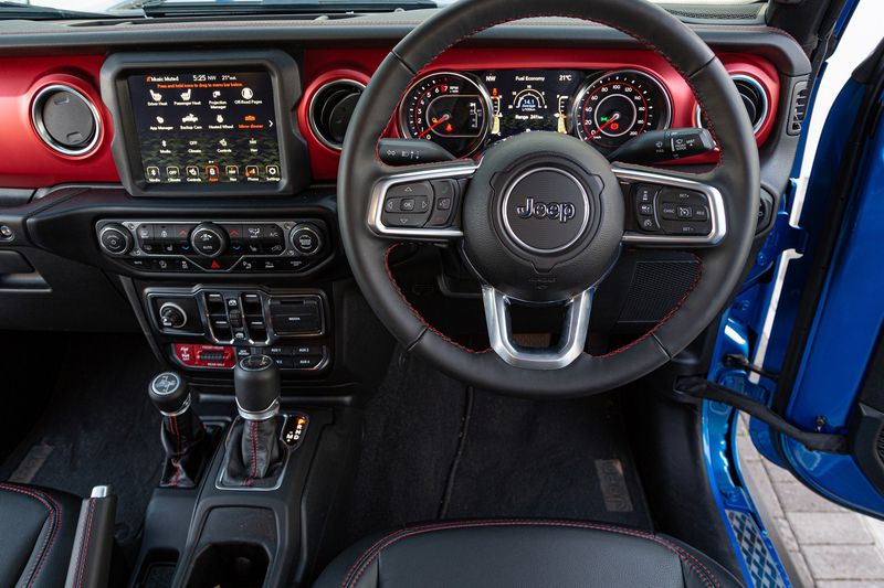 Red stitching on the dashboard, lever boots and seats complements the Gladiator’s bright fascia insert.