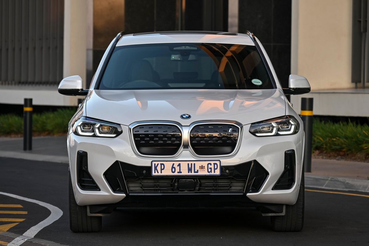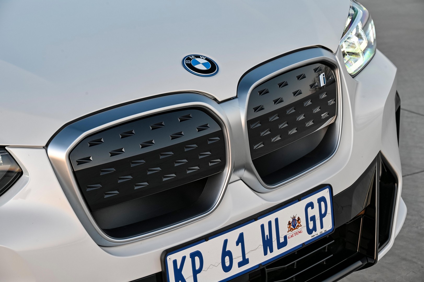 The closed grille, blue-rimmed BMW logo and subtle i logo are unique to iX3.