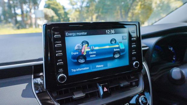 The Eco readout on the Corolla Hybrid’s infotainment screen shows the flow of energy in the power unit.