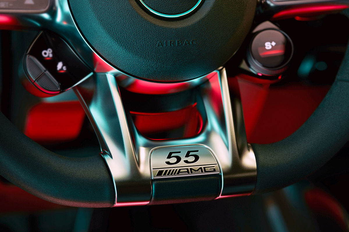 Available exterior paint colours include Cosmos Black Metallic and the Digital White Metallic hue you see here, while the cabin gains black and red elements. The AMG Performance seats are upholstered in two-tone leather, with the microfibre-trimmed AMG Performance steering wheel scoring “Edition 55” badging. Other distinguishing features include door-sill panels with red illuminated AMG lettering and black velour AMG floor mats with red contrasting stitching and “Edition 55” lettering woven in red.