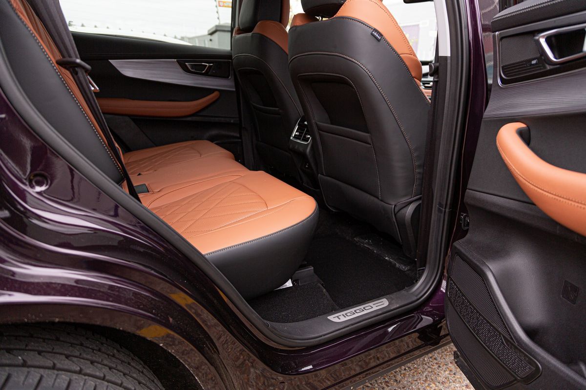 The leather seats on the Tiggo 8 feature what appears to be high quality, soft leather.