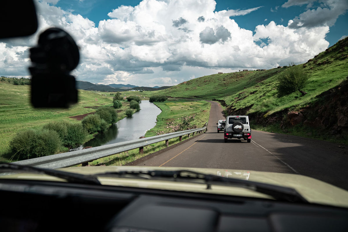 As we ventured through the landscape, we passed Afriski, which looked particularly odd with the ski slope being all green and grassy, with no snow in sight. After that, we set off on a jeep track that took us deeper into the scenery and we stopped to pitch a portable braai (as proud South Africans do). We uttered that famous line: “Nou gaan ons braai!” – in the middle of nowhere – and even used the Jimny’s bonnet as a table for the snacks. A thunderstorm started rolling in, so we packed up and got back onto the tar road. We passed a mining area and stopped, once more, at a beautiful lookout point.