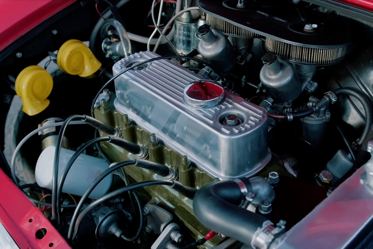 The restoration was thorough: Nadia stripped the car to bare metal, addressed rust and countless drilled holes, and repainted it in the iconic Tartan Red with an Old English White roof.