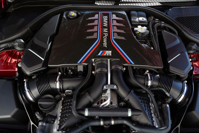 The M5 Competition’s carbon-fibre engine cover is a work of art.