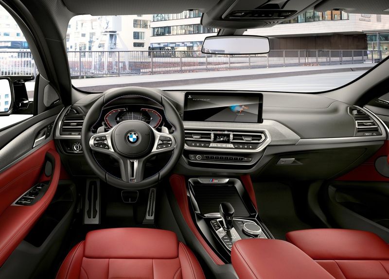 Inside, the BMW X4 LCI M will receive powered M sport seats with illuminated M logos, Merino leather upholstery, Alcantara knee pads on the center console, the M multifunction steering wheel, M seat belts, and other goodies.