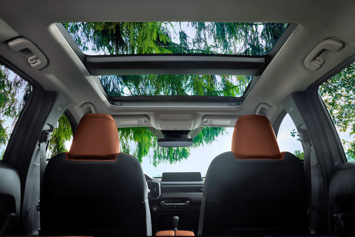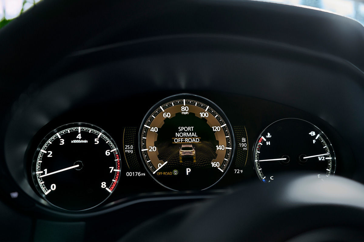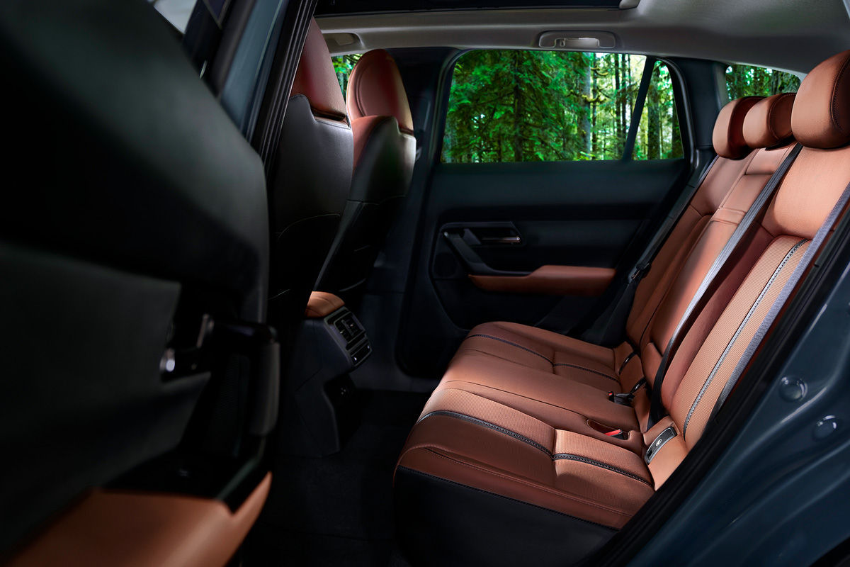 As expected, the CX-50’s upmarket cabin has a minimalist design, with a driver-oriented layout at the front. It’s not particularly distinctive (to be fair, that’s not Mazda’s modus operandi), but piano black inserts, subtle metallic finishes and contrast stitching, which matches the optional terracotta leather trim, complete the look. The model also features a panoramic moonroof; it’s reportedly “a first for Mazda.”