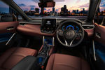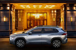 The Corolla Cross effectively fuses the design language of the Corolla Sedan and Hatch models with an SUV-shape. Large, elongated headlamps flank a prominent trapezoidal grille, which is accentuated by the broad, upswept lower bumper. Deep vertical design lines on the outer edges of the bumper help create a substantial frontal view. The side profile is characterised by pronounced fender flares, replete with black cladding, which ties in with the side skirts and bumper trim. The rear, meanwhile, employs large elliptical taillamps with trapezoidal detailing and crease lines.