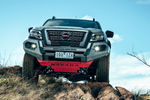 As was the case with its predecessor (the N-Trek Warrior), the PRO-4X Warrior features a high-mounted front bumper with an integrated bull-bar and LED lighting strip, chunky black fender flares and a wide-legged sport-bar, increased underbody protection (in the form of a red-finished and branded steel underbody bash plate), as well as black alloy rims shod with high-profile Cooper all-terrain tyres.