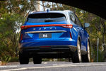 The side-window area, meanwhile, narrows towards the rear, where blacked-out C-pillars create a floating roof effect, while at the rear, the newcomer’s shoulder lines slope gently downward to meet the top edges of the ornate LED tail-light clusters. Although less pronounced than on the EV6, the new Sportage’s tail lights blend into a distinct ridge halfway up the tailgate, which effectively kicks up the rear end.