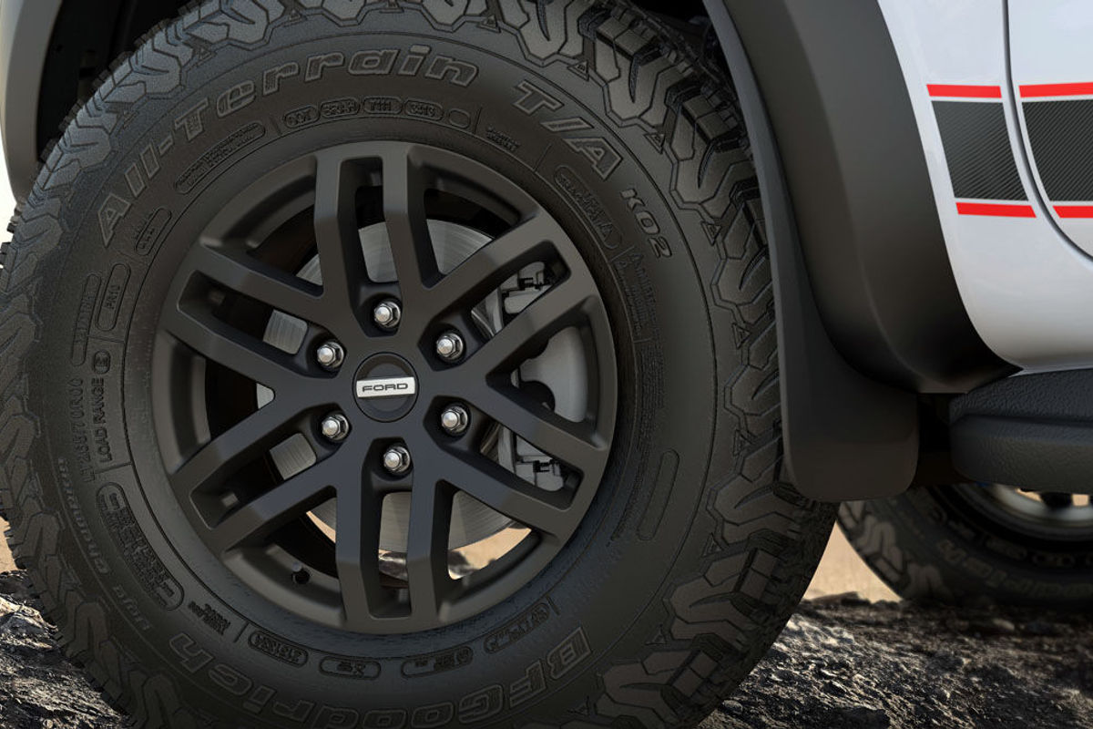 The Ranger Raptor X's 17-inch wheels, which are shod with specially developed BF Goodrich All-Terrain 285/70 R17 KO2 tyres, have been refreshed with an Asphalt Black matte finish.