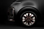 The front-end features a horizontal DRL strip as well as a uniquely-patterned grille which is flanked with low-set 8-piece headlights. From the side, the Staria features a lowered beltline which allows for a panoramic glasshouse which creates a sense of openness when sitting inside the Staria. Inspiration for this design is derived from a Korean architectural style known as hanok which connects the outside world with the inside. At the rear, the Staria features vertical tail lights with a wide rear window.