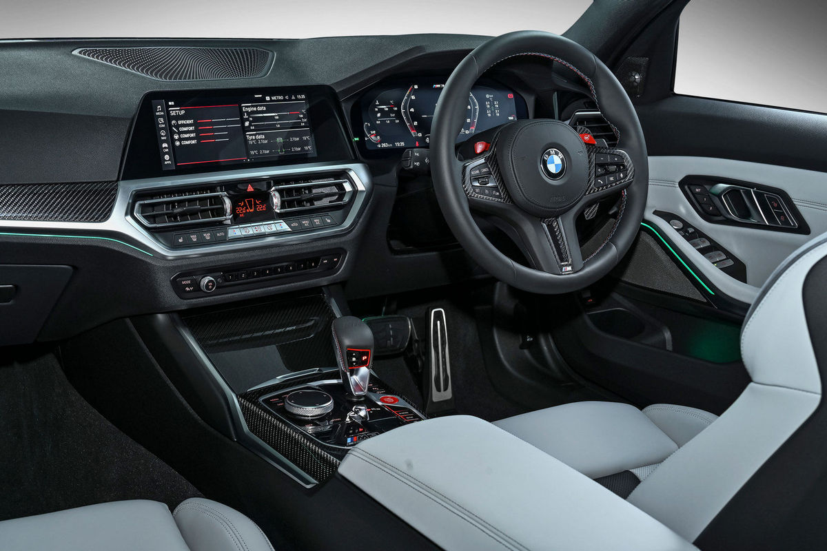 All M3 and M4 derivatives in the South African market will be sold with the carbon interior package which, as the name suggests, includes carbon-fibre inserts around the cabin, most notably on the inside of the steering wheel, the transmission-lever surround (plus the iDrive console) and in front of the passenger seat. It’s not wildly different from the look of the standard 3- or 4-Series interior, unless you additionally specify the (R80k) bucket seats, which are 10 kg lighter than the standard ones and offer better structural rigidity and support. You slide in over the side bolsters and are met by what feels like (let's just call it) a crotch support between your legs, just like the 5th belt in a race car. The seats can best be described as slim-fit, so if you’re of a burlier design, you may find them a bit uncomfortable.