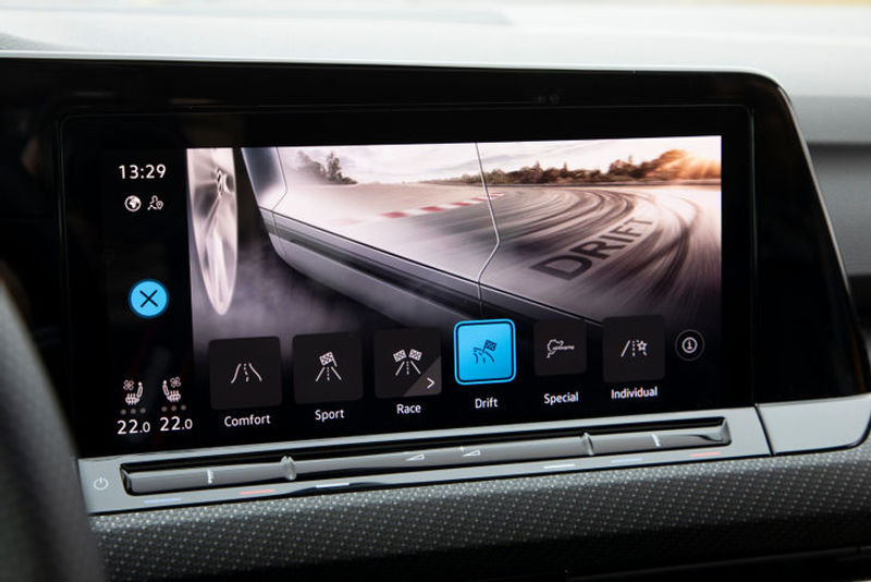 The driving modes are selected in the same way as the Golf 7, the 8 R gets a unique drift mode.