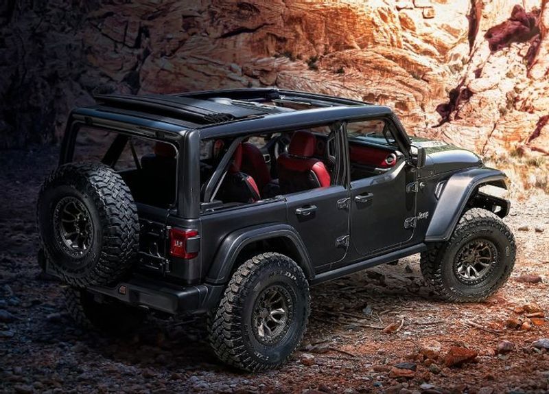 Aesthetically speaking, the Jeep Wrangler Rubicon 392 Concept really looks the part with its bronze-accentuated tow hooks, badging, springs, shocks and wheels. The half doors are unmistakably Jeep and the entire package looks ready to tear up the asphalt, gravel, sand, you name it!