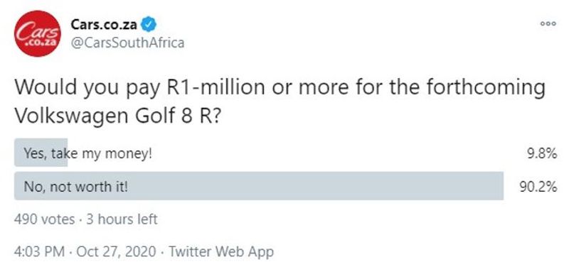 We put out a poll on the Cars.co.za Twitter page asking our audience the question ‘Would you pay R1-million or more for the forthcoming Volkswagen Golf 8 R?’
