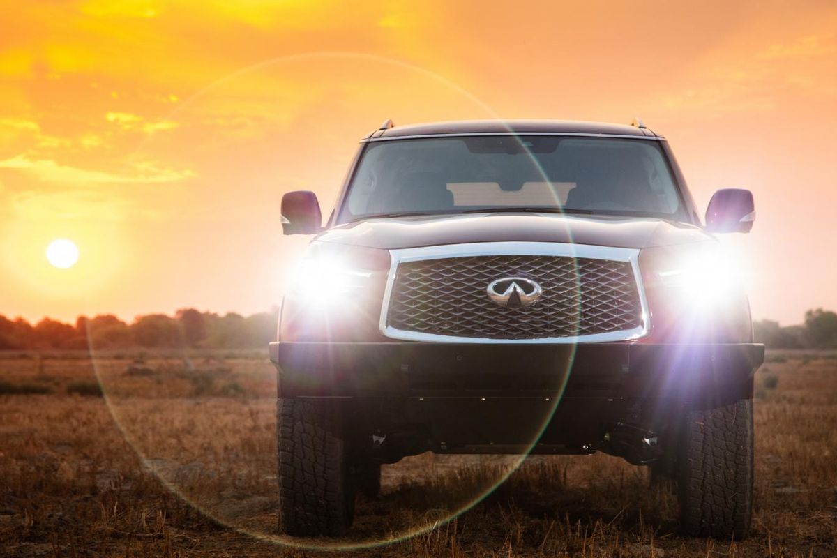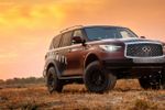 The overlanding Infiniti QX80 has terrific presence, thanks to a lift kit and steel bumpers at both ends. Infiniti replaced the factory plastic bumpers with more robust and impact resistant steel components, increasing both approach and departure angles too.