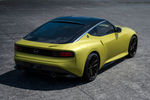In profile, the contour of the black roof flows elegantly from the B-pillars to the squared-off rear to create that distinctive fastback look reminiscent of the 1st-generation Z. The transition from the rear quarter glass to the subtle C-pillars (adorned with retro Z logos) and past the sensuously flared rear fenders, all the way to the wraparound LED tail lights is striking.