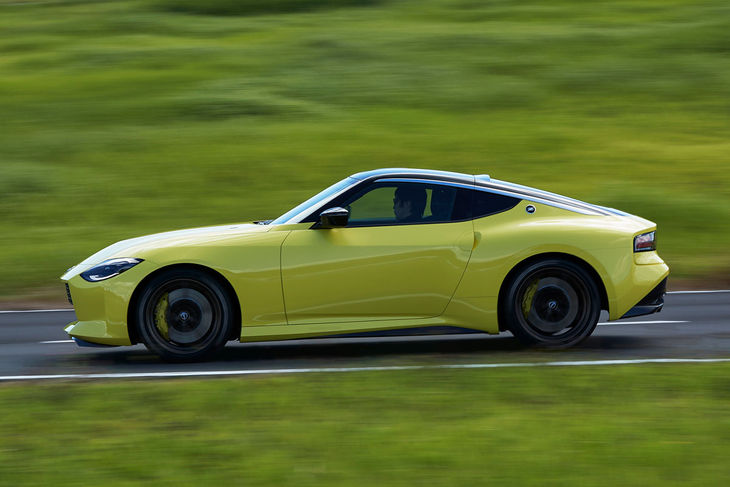 The shapes of the coupe’s bonnet and LED headlamps take their cues from the original Z car, while the rectangular grille references that of the current model, with the exception of oval-patterned mesh that updates the look and the addition of a carbon-fibre splitter.