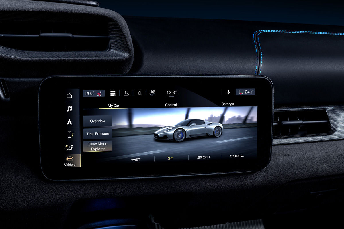 Inside, the MC20 is sportily-clad in leather and Alcantara with bright contrast stitching and no shortage of carbon-fibre finishes, especially on the steering wheel (which is endowed with large paddle shifters) and centre console, where drivers can switch between Wet, GT, Sport and Corsa drive modes via a rotary switch. There are also buttons to select automatic/manual and reverse.