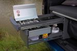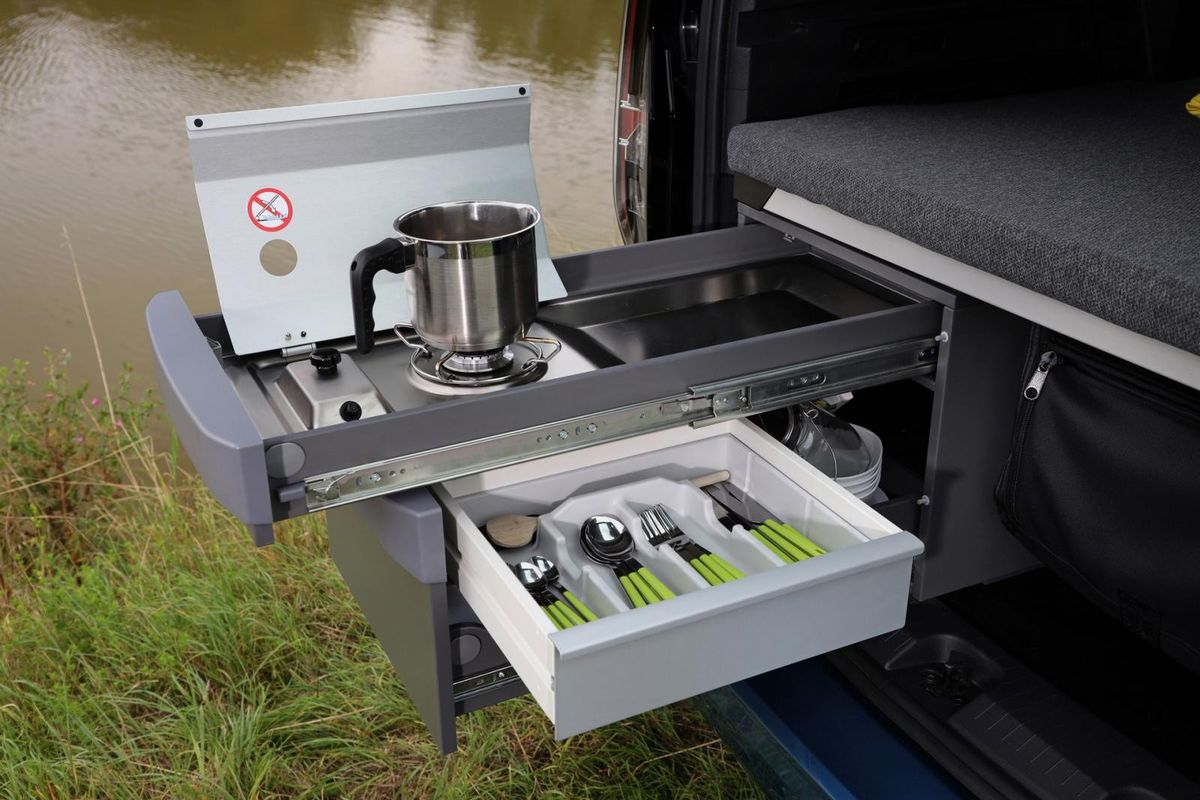 The Caddy California is also equipped with a mini kitchen unit that can be pulled out of a compartment in the load bay and comprises a gas stove with a windshield and a lower tray for storing cooking and eating utensils. Extra goods can be stored in 5kg storage bags placed at the rear side windows for easy access.